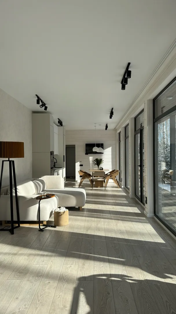 Дом тёплый, светлый и продуман до мелочей. Из панорамных окон открывается вид на зимний лес — особенно красиво, когда пар из сауны смешивается с холодным воздухом.